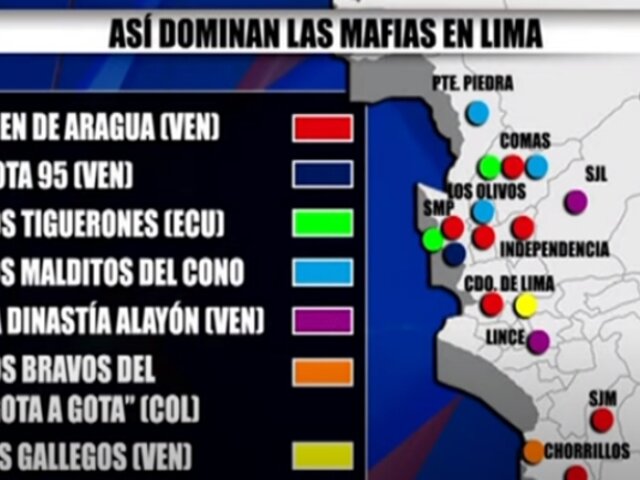 Mientras que la organización “Cota 95” habría tomado el distrito de San Martín Porres, la banda ecuatoriana “Los Tiguerones” estarían operando en Comas y San Martín de Porres. En tanto, ‘Los Malditos del cono’ tendrían presencia en Puente Piedra, Comas y Los Olivos. ‘La dinastía Alayón’ se encontraría en Lince y San Juan de Lurigancho, ‘Los bravos del gota a gota’ operarían en Chorrillos. Finalmente, ‘Los gallegos’ se ubicarían en el cercado de Lima.