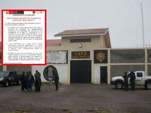 El Instituto Nacional Penitenciario (INPE) informó mediante un comunicado sobre la muerte de un recluso en el penal de Challapalca, ocurrida la tarde del 25 de marzo. El interno, identificado como Eber Arellan Solis, habría fallecido tras ser agredido por otro recluso.