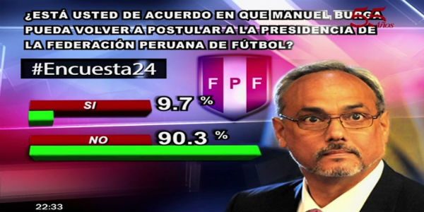 En Encuesta 24, a la pregunta “¿Está usted de acuerdo en que Manuel Burga pueda volver a postular a la presidencia de la Federación Peruana de Fútbol?”, un contundente 90.3% respondió que no.