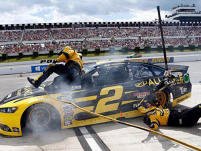 Los espectadores se llevaron un gran susto cuando el piloto Brad Keselowski atropelló a sus compañeros de equipo en una parada en pits.