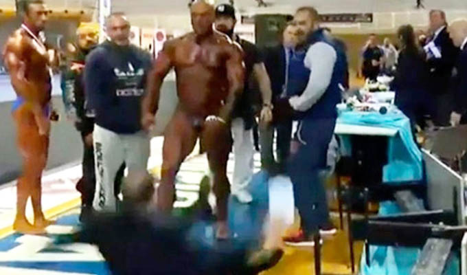 El enfurecido atleta griego se acercó a uno de los jueces y le dio tremendo puñetazo, como se fuera poco, segundos después, mostró sus genitales frente al presidente de la federación internacional de fisicoculturismo.