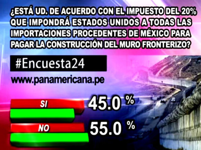 A la pregunta de este jueves en Encuesta 24: ¿Está usted de acuerdo con el impuesto del 20% que impondrá Estados Unidos a todas las importaciones procedentes de México para pagar la construcción del muro fronterizo? un 45% respondió ‘SÍ’, mientras que un 55% contestó ‘NO’.