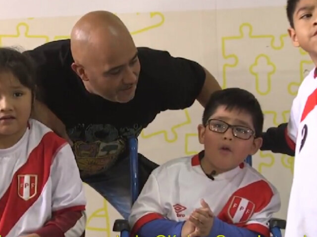 “De los guerreros de la clínica San Juan de Dios a los guerreros de la selección: ¡Arriba, Perú!”, exclama uno de los pequeños al lado del cantante Marco Romero y otros integrantes de la institución.