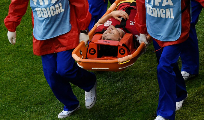 En el debut peruano ante Dinamarca, William Kvist tuvo que ser trasladado en camilla fuera de la cancha de juego, luego de disputar un balón aéreo con Jefferson Farfán.