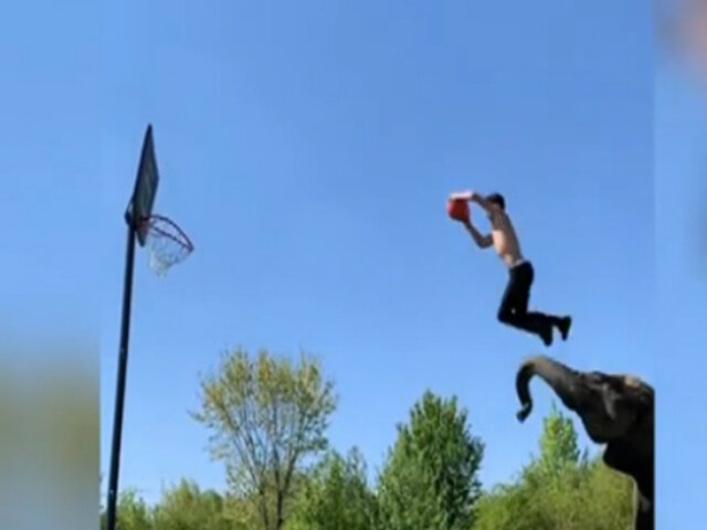 En las impresionantes imágenes que fueron difundidas en Instagram, se observa cómo es impulsado por este paquidermo, quien lo ayuda a encestar.