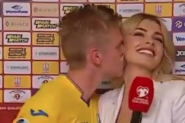 Tras el triunfo de un partido clasificatorio de la Eurocopa, Oleksandr Zinchenko, jugador del equipo inglés Manchester City y de la selección nacional de Ucrania, le dio un beso en la mejilla a una reportera durante una transmisión en vivo.