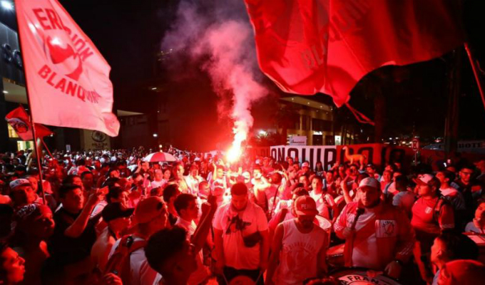 Horas previas al partido entre Perú y Chile por la final de la Copa América 2019, hinchas realizaron un banderazo en los exteriores del hotel de la ‘Blanquirroja’, en Porto Alegre, para brindarles su apoyo incondicional.