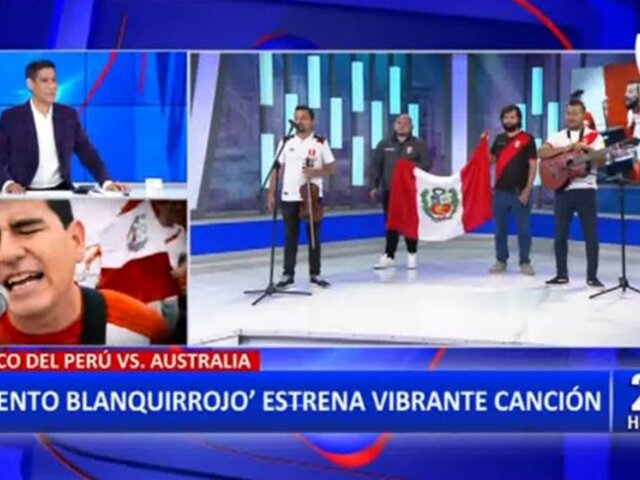 En entrevista con Paco Flores, los integrantes de "Aliento Blanquirrojo" anunciaron el estreno de un nuevo tema como forma de ponerle ritmo a la previa de este compromiso que nos permitiría participar de la máxima fiesta del fútbol por segunda vez consecutiva. La conocida banda ofreció un pequeño extracto de su nueva conación interpretándola en vivo para Panamericana Televisión.