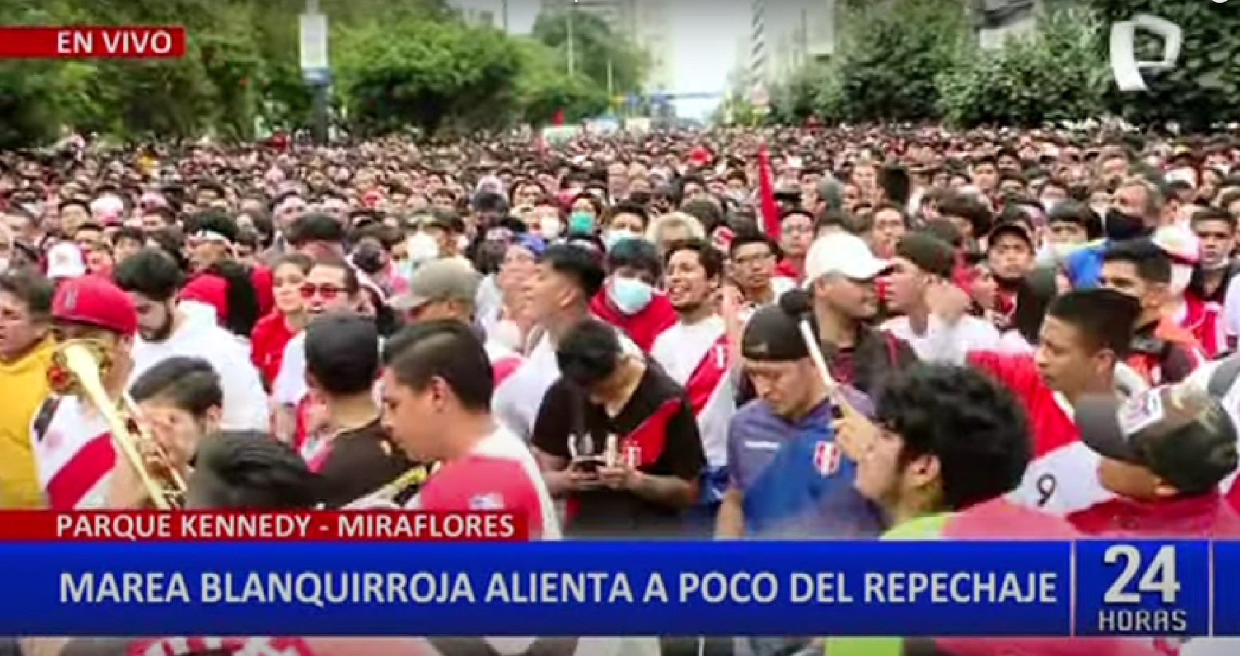 Cientos de hinchas peruanos se reunieron para alentar este lunes a la selección peruana en el Parque Kennedy, en el distrito de Miraflores, donde se colocó una pantalla gigante. La 'blanquirroja' disputa el repechaje al Mundial Qatar 2022 ante Australia.
