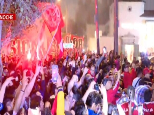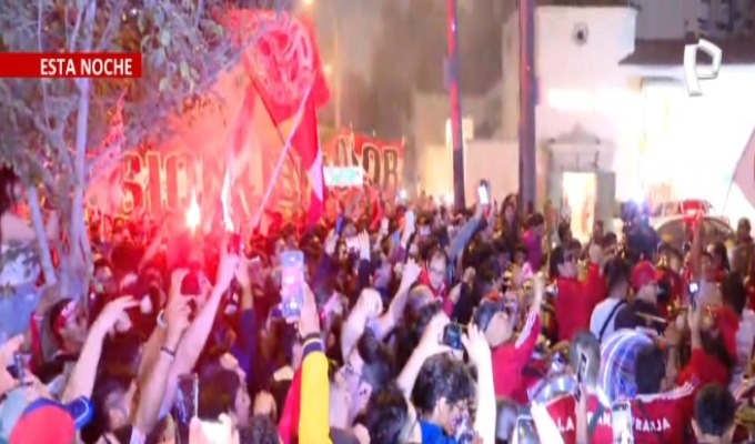 Cientos de hinchas peruanos se apostaron en los exteriores del hotel de concentración de la Selección Nacional para realizar el tradicional banderazo previo al partido de mañana frente a Brasil por la segunda fecha de las Eliminatorias.