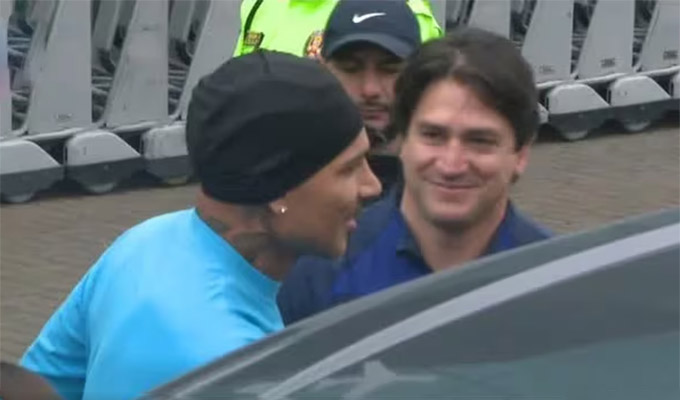 Con un llamativo ‘outfit’ celeste, el futbolista, de 40 años de edad, atravesó la puerta de viajes internacionales del aeropuerto Internacional Jorge Chávez, lo acompañaban su pareja Ana Paula Consorte, la hija de la brasileña y sus dos pequeños hijos.
