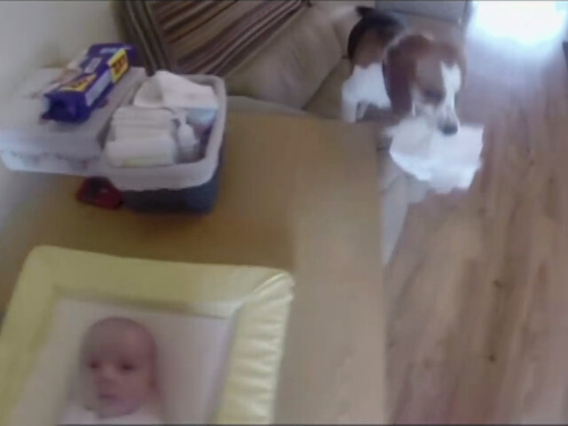 Un singular perro de raza Beagle ayuda en el cuidado del pequeño hijo de su dueña, realiza actos como entregarle un nuevo pañal hasta se deshace del pañal sucio.