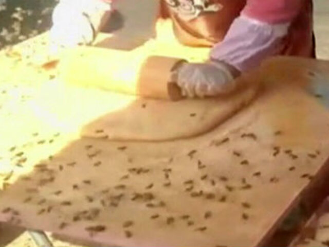 Observen bien estas impresionantes imágenes. Un vendedor ambulante en China hace sus postres tan dulces que cientos de abejas invaden su puesto.