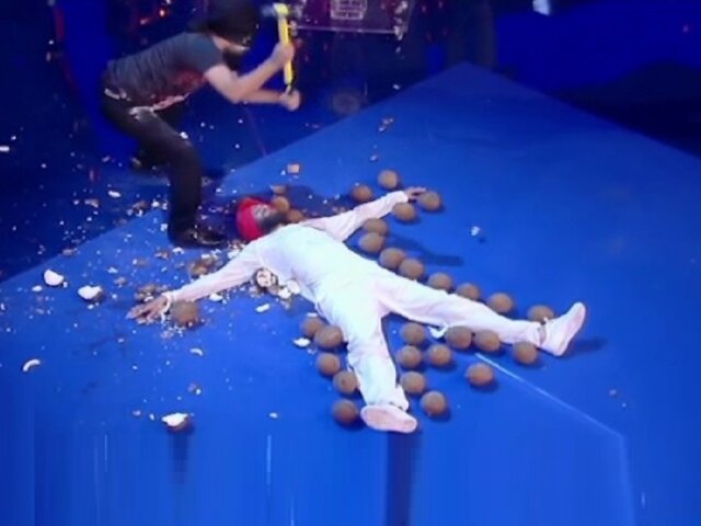 Acto seguido le dieron un mazo para que rompa los cocos, y al conteo de tres iniciaron su acto de extremo peligro.