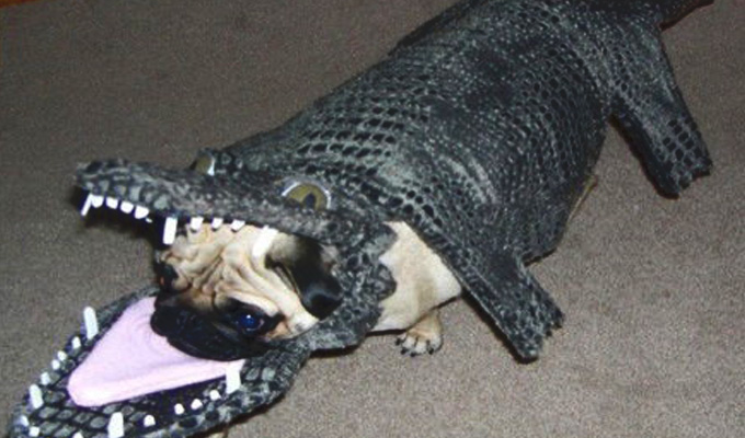 No tuvieron mejor idea que disfrazar a un perro como cocodrilo y atemorizar a todo aquel que se cruzara con el feroz “Perro-drilo”.