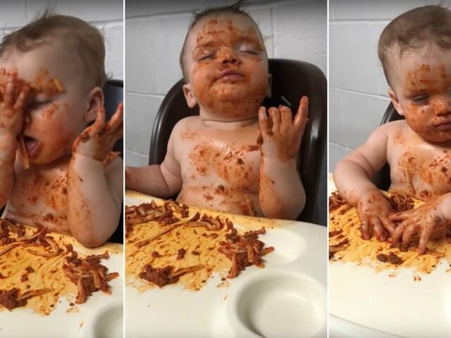 Como este bebé al que no le importa que el sueño lo quiera vencer. El pequeño toma una y otra vez con sus manitos cada tallarín sin importar que su cuerpo se ensucie con la salsa.