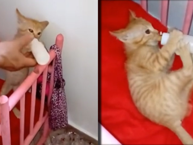 Gatito que pide y toma biberón en su cuna es sensación en redes sociales