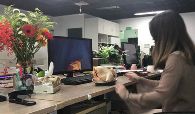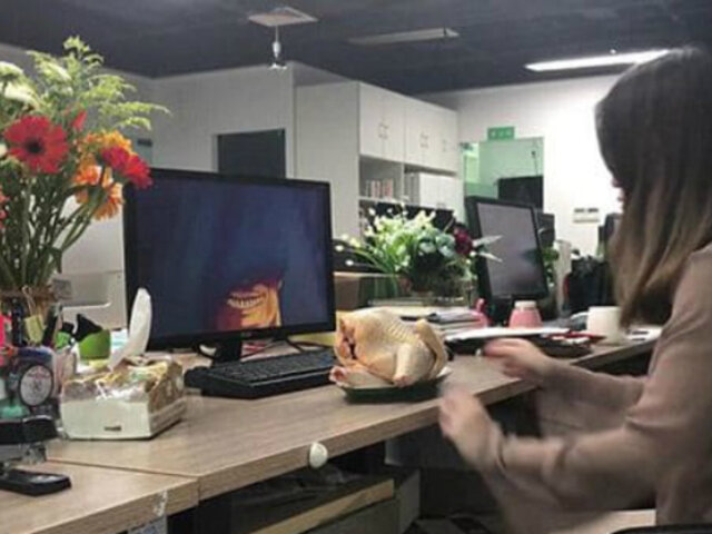 En el video, la señorita ha cambiado la cocina por la oficina. Su ambiente de trabajo se ha convertido en el lugar predilecto para realizar la comida. Allí la adereza, corta y hasta enciende fuego para poder cocinar.