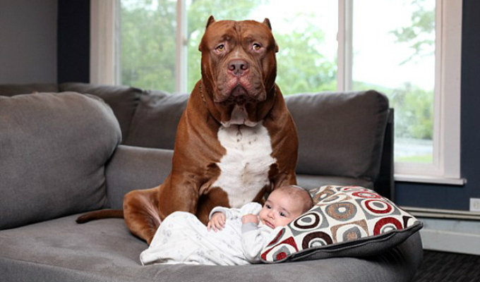 El bebé pesa 3.5 kilos y el imponente pitbull que lo resguarda 80 kilos. La inmesa mascota, considerada el perro más mortal del mundo, tiene un nuevo dueño y es capaz de todo para protegerlo.