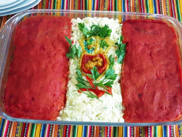 Pero este plato no solo destaca por su sabor sino por su creatividad presentación ya representa la bandera con el escudo patrio en medio, dibujado con hojas de perejil, pimentón y otros insumos.