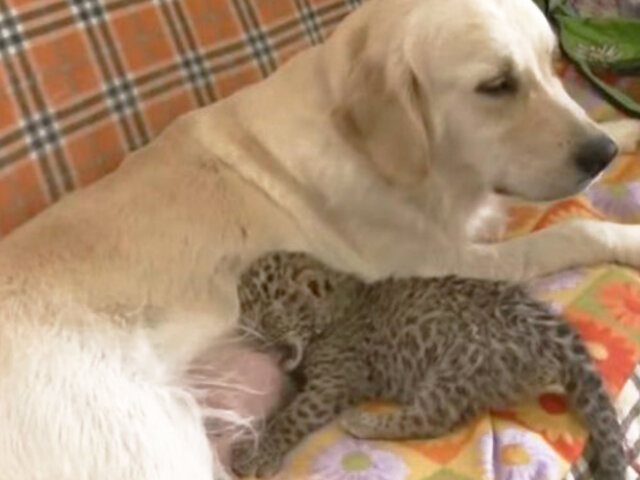 En Rusia, en el zoológico de Vladivostok, una perrita llamada Tessi, protege y alimenta a un leopardo recién nacido, como si fuera su propia cría. Según informaron medio rusos los responsables del lugar en el que nació el pequeño leopardo decidieron apartarlo de su madre porque es un felino muy agresivo y podía dañarlo.