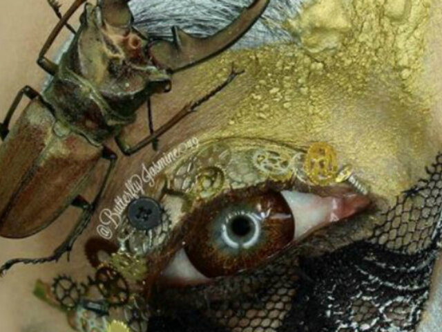 Aunque suene trillado, ella intenta revolucionar el concepto del maquillaje a través de elaborados y coloridos obras de maquillaje donde el detalle especial se lo llevan estos insectos disecados.