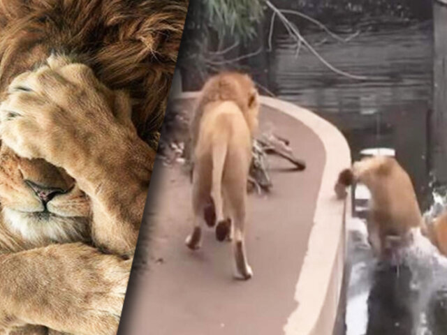 El hecho fue captado cuando dos leones caminaban por el borde de un lago artificial y uno de estos resbaló por accidente cayendo al agua desatando las risas entre los asistentes y uno de ellos lo registró y rápidamente compartió las imágenes en las redes sociales.