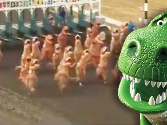 La insólita competencia ocurrió en el hipódromo Emerald Downs, en Washington, donde varias personas participaron vestidos como feroces T-Rexs. Como resultado, la competencia dejó a los corredores sin aliento, debido al esfuerzo y a los aparatosos trajes de dinosaurio, al más puro estilo "Jurassic Park".