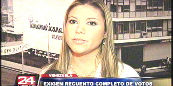 Paulina Facchini, la coordinadora de la campaña de Henrique Capriles en Lima, instó a los organismos internacionales investigar las denuncias de irregularidades en las elecciones de Venezuela.