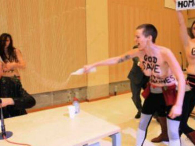 Activistas semidesnudas de Femen le arrojaron agua bendita al arzobispo belga al que acusaron de homofóbico.