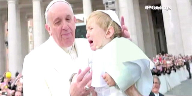 El Papa Francisco besó a un bebé que fue disfrazado con una sotana blanca en la plaza de San Pedro. Si bien al inicio, el Papa no se dio cuenta de la presencia del menor.