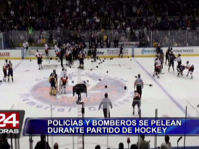 El partido amistoso de hockey sobre hielo, entre policías y bomberos, fue suspendido tras la descomunal pelea entre los jugadores.