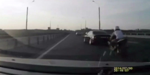 Un motociclista chocó contra un auto y en vez de caer sobre la pista terminó en el techo del vehículo. Una cámara grabó este y otros incidentes.