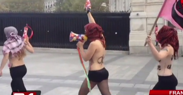 En la capital francesa, activistas del grupo Femen protestaron con el torso descubierto y fusiles de juguete contra el extremismo del Estado Islámico. Asimismo, exortaron a otras personas a unirse a su manifestación.