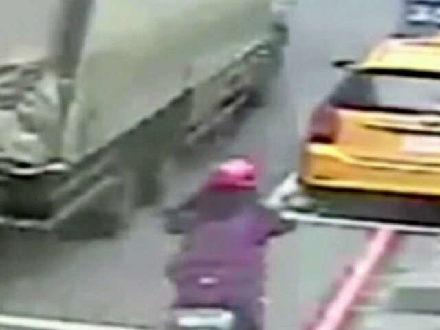 Taiwán: motociclista se salva de ser atropellada por tráiler