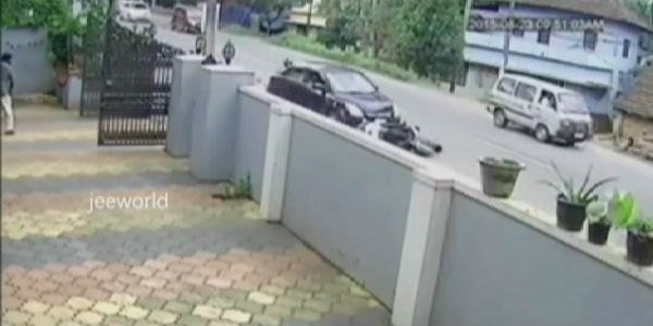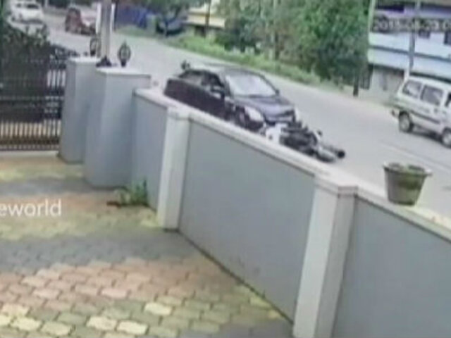 Un motociclista perdió la vida tras ser impactado por un automóvil en una transitada calle de la India. El sujeto manejaba acompañado de un amigo, cuando fueron alcanzados por un vehículo. Uno de ellos quedó en estado grave, mientras que su amigo murió camino al hospital. Una cámara grabó esta y otras imágenes que podrían herir su sensibilidad.