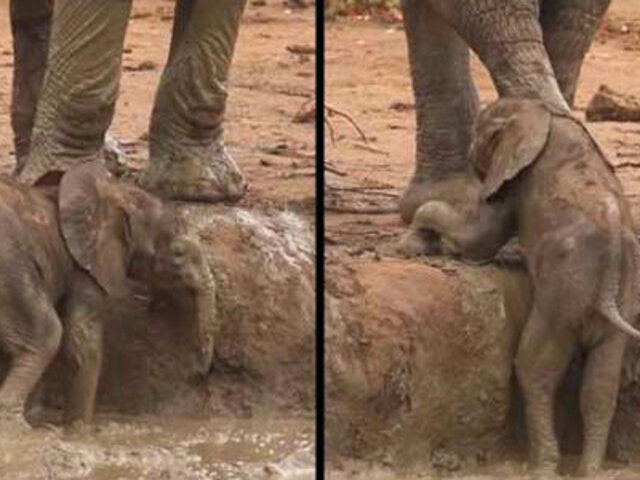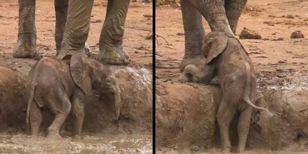 En Sudáfrica, un pequeño y travieso elefante cayó en un pozo de lodo mientras caminaba junto a su manada. El animalito hace todo lo posible para salir pero le fue imposible. Su madre intenta ayudarlo pero tampoco lo consigue. Hasta que finalmente otro miembro de la manada con más experiencia se acerca y con su trompa lo saca del peligro.