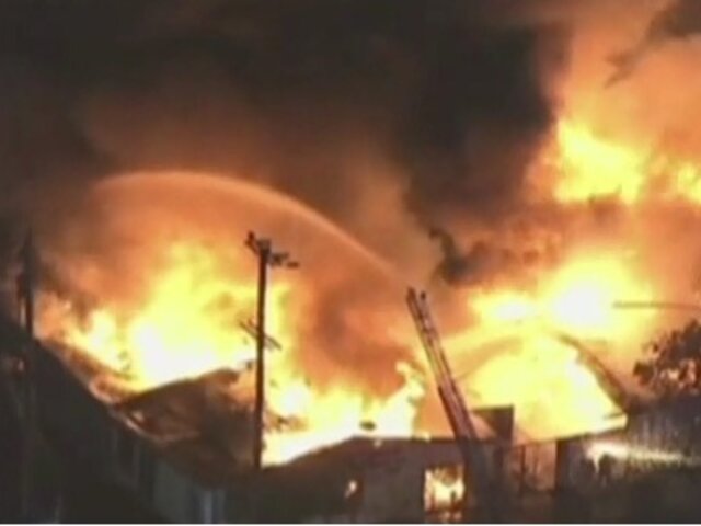 Un edificio industrial en Los Ángeles colapsó por las llamas tras un incendio de grandes proporciones que se originó por la fuga de gas propano y la explosión de uno de los contenedores.