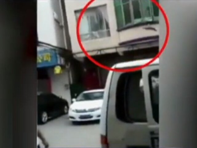 Minutos después el pequeño cayó, por fortuna fue rescatado por los vecinos que sujetaron una colcha debajo, para evitar que impacte en el suelo.