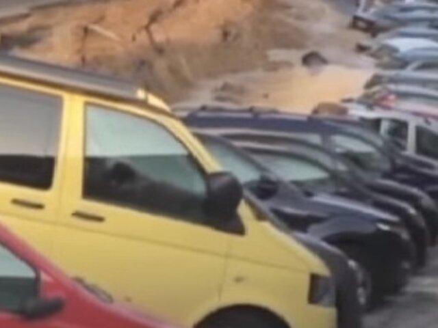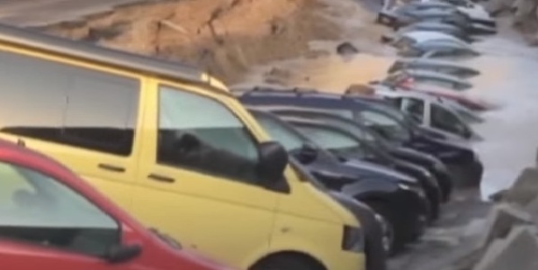 Los vehículos permanecieron estacionados desde la noche anterior al momento del derrumbe. Los bomberos creen que una explosión del conducto de agua provocó que la carretera cediera.