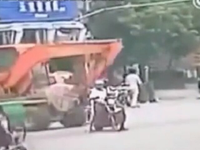 En China, un motociclista murió al ser arrollado por una excavadora. El sujeto esperaba el cambio del semáforo para cruzar la pista, cuando de pronto el vehículo pesado lo embistió por detrás.