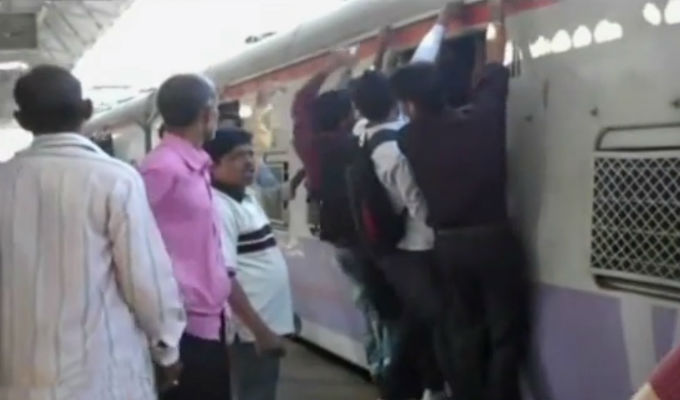 Un video aficionado viene causando asombro entre los internautas porque se muestra cómo varios pasajeros intentan subir a un tren cuando todavía está en movimiento en una estación de Bombay, en la India.