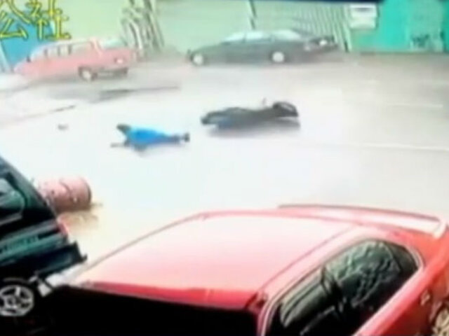 Un motociclista que circulaba por una calle salió despedido de su vehículo cuando fue impactado por una lámina de calamina, arrastrada por las fuertes ráfagas de viento provocadas tras la llegada del súper tifón Meranti, que viene causando estragos en Taiwán.