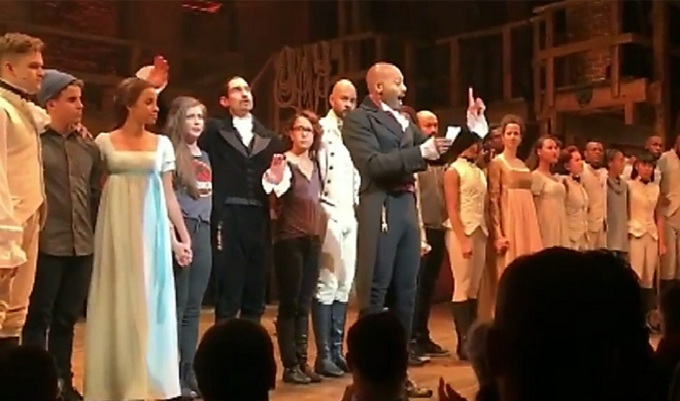 Brandon Victor Dixon, uno de los actores, pronunció estas palabras: "Nosotros, señor, somos un país diverso que está alarmado de que su nueva Administración no nos proteja, ni a nuestro planeta, ni a nuestros hijos, ni a nuestros padres; o que no nos defienda a nosotros ni defienda nuestros derechos inalienables".