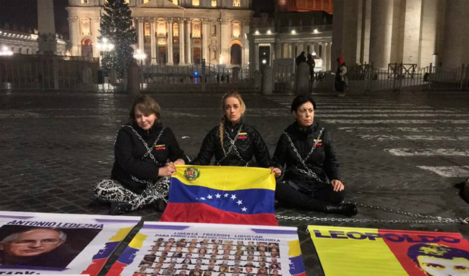 Lilian Tintori, esposa del opositor venezolano Leopoldo López, se encadenó el último domingo frente al Vaticano, para exigir la liberación de los presos políticos en Venezuela por el régimen de Nicolás Maduro.