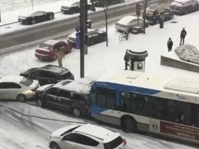 En Canadá la fuerte nevada que azota Montreal provocó un choque múltiple. En las imágenes se observa cómo un autobús patina debido a que la pista estaba congelada y embiste a varias unidades.