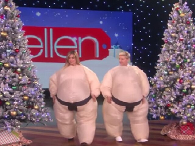 Jennifer Aniston fue la invitada especial en el programa de Ellen DeGeneres y ambas nos regalaron un divertido momento al enfrentarse disfrazas de sumo.