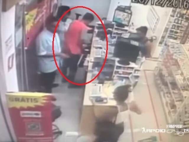 Las cámaras de seguridad de una farmacia en la ciudad brasileña de Sao Paulo registraron el trágico final de un joven, que asaltó una farmacia junto a dos compinches.