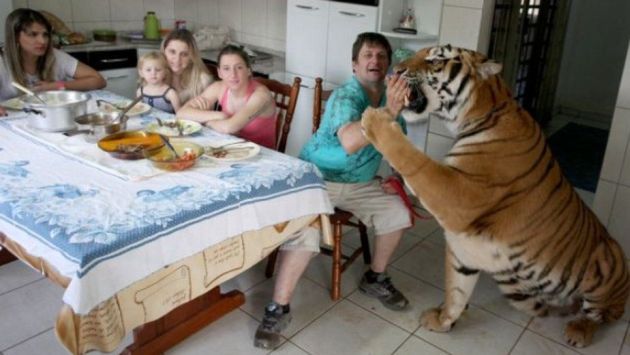 Además de convivir con ellos, los tigres también comparten la mesa de Amir y no precisamente para el desayuno, almuerzo o cena sino para un descanso placentero.