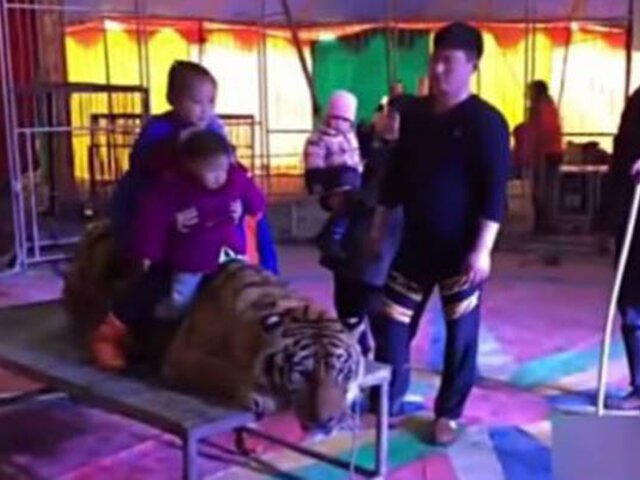 Un video muestra la forma en el que trabajadores de un circo chino inmovilizan a un tigre para que los visitantes lo monten y se tomen fotografías.